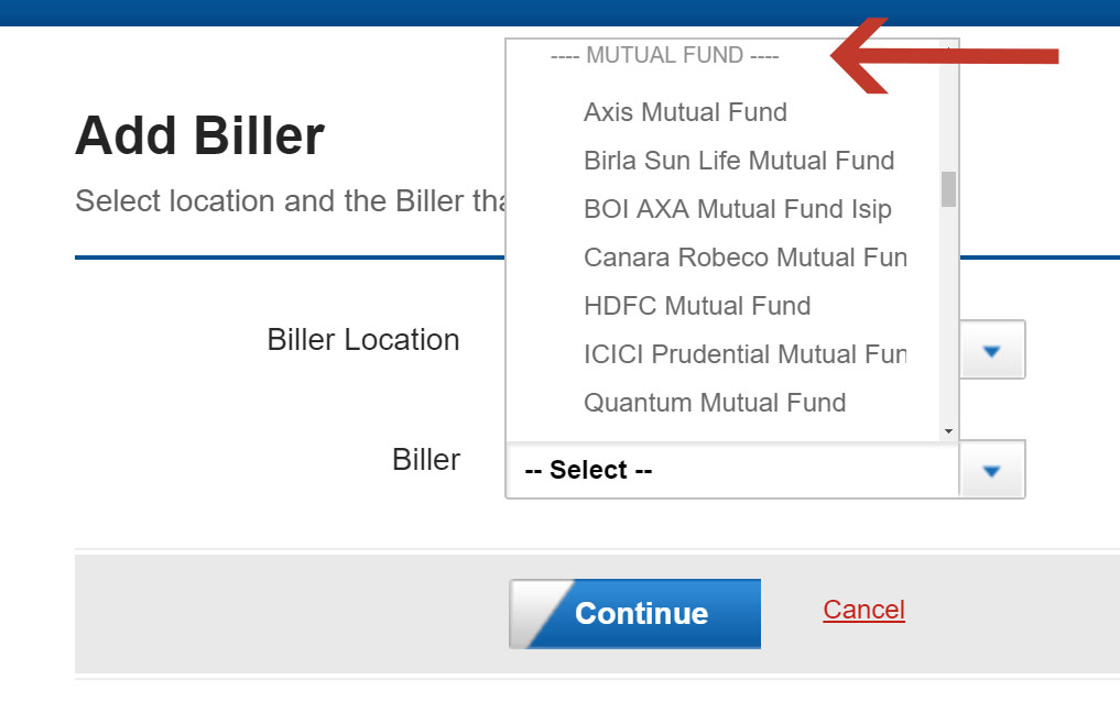 Step-4: In biller go to Mutual Fund section and select your fund house or BSE.